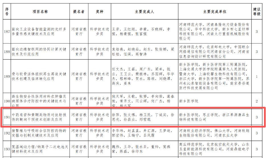 其中,由我校食品科学与制药工程学院特聘高层次专家人才徐萍教授作为第一完成人申报的“中药皂苷和黄酮类物质对放射损伤的靶向干预技术创新及应用”项目,荣获河南省科技进步三等奖。